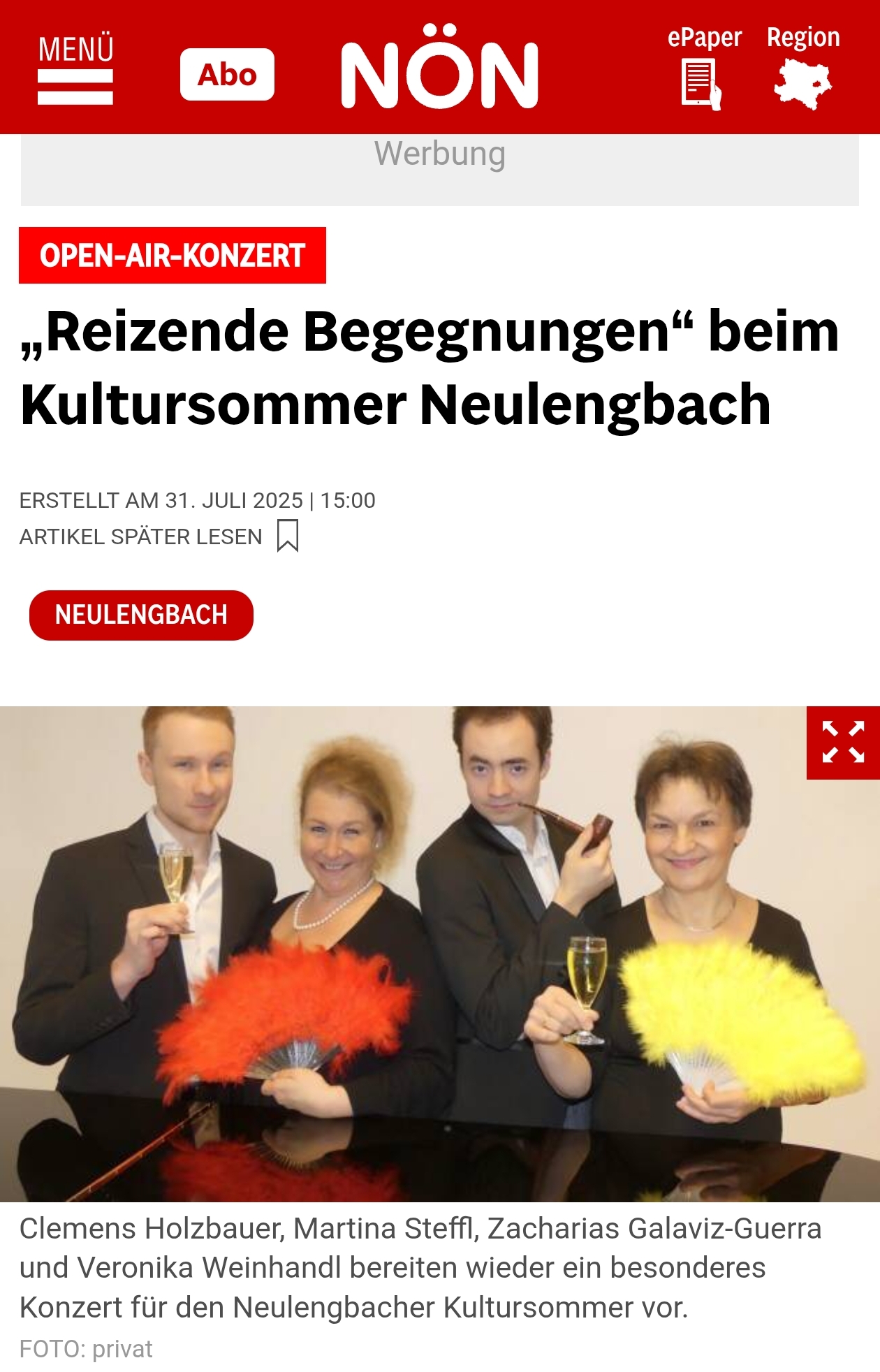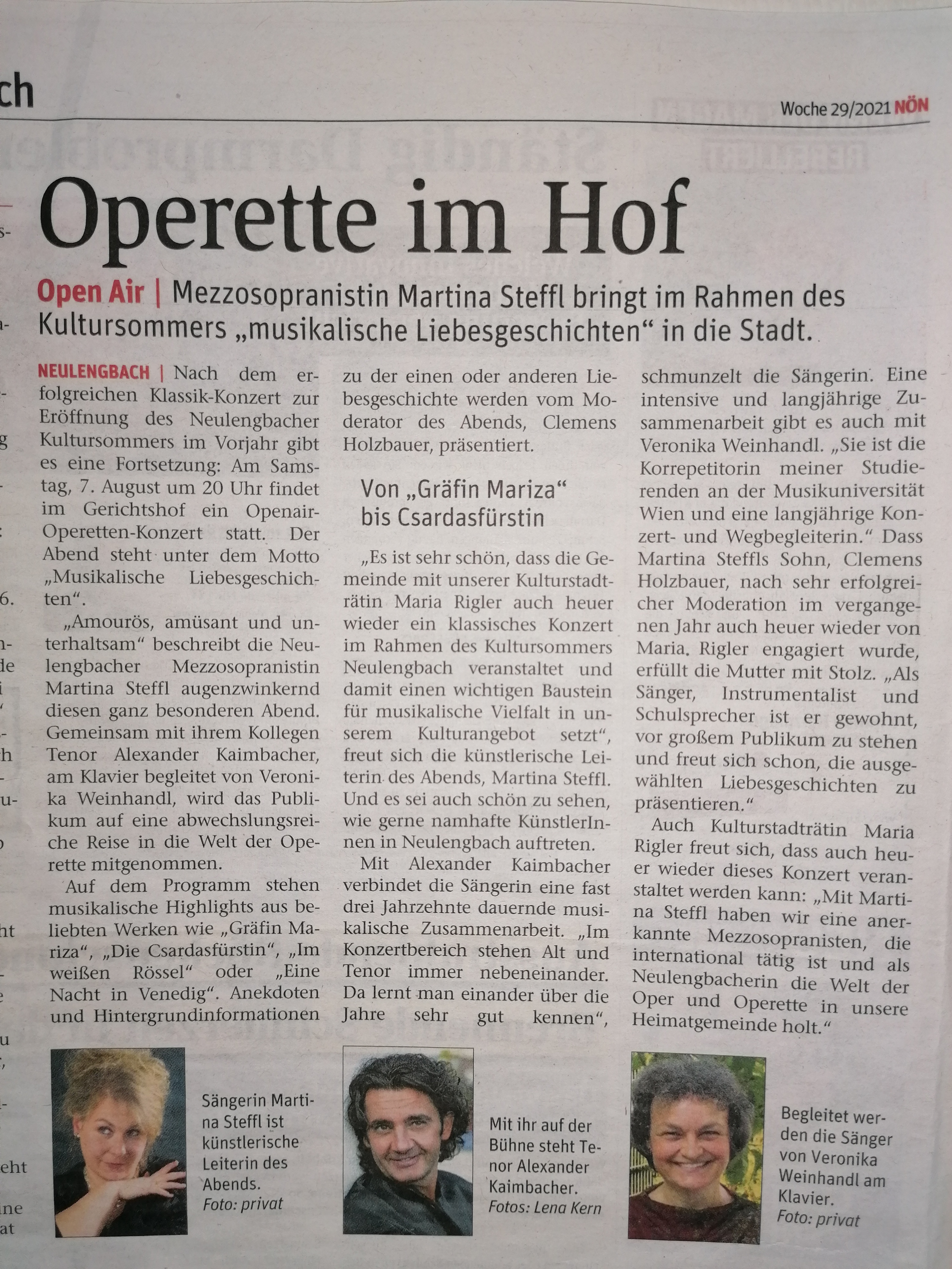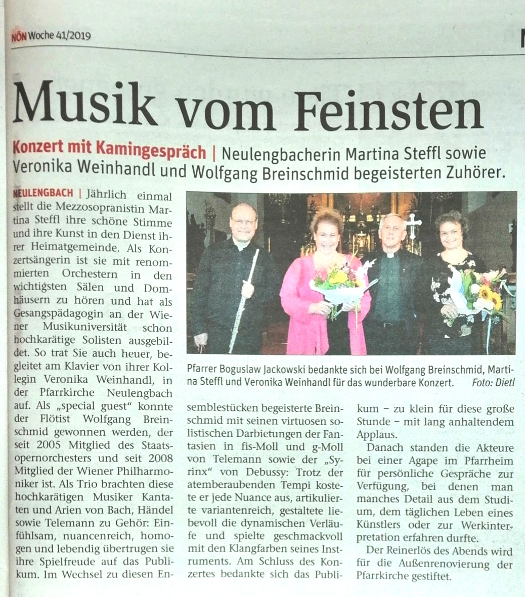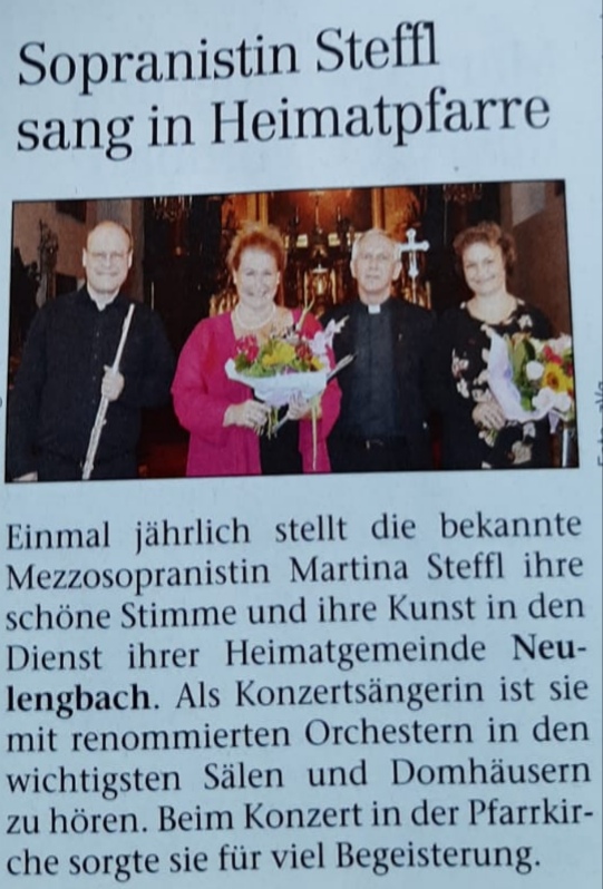 „Reizende Begegnungen“ und viel Applaus beim Open Air in Neulengbach.Die Neulengbacherin Martina Steffl, die als gefragte Solistin mit renommierten Instrumentalisten in großen Konzertsälen und Domkirchen konzertiert und seit 2004 an der Musikuniversität in Wien eine Gesangsklasse unterrichtet, überzeugte mit ihrer schönen und großen Stimme, die sie sicher auch über schwierigste Koloraturen führte.